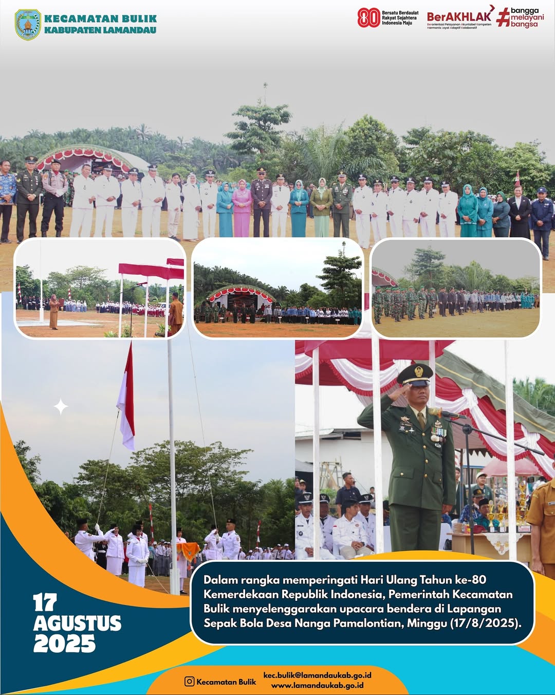 Nanga Pamalontian – Gema peringatan Hari Ulang Tahun (HUT) ke-80 Kemerdekaan Republik Indonesia terasa khidmat di Kecamatan Bulik. Pemerintah Kecamatan Bulik menggelar upacara bendera yang dipusatkan di Lapangan Sepak Bola Desa Nanga Pamalontian pada hari Minggu, 17 Agustus 2025.